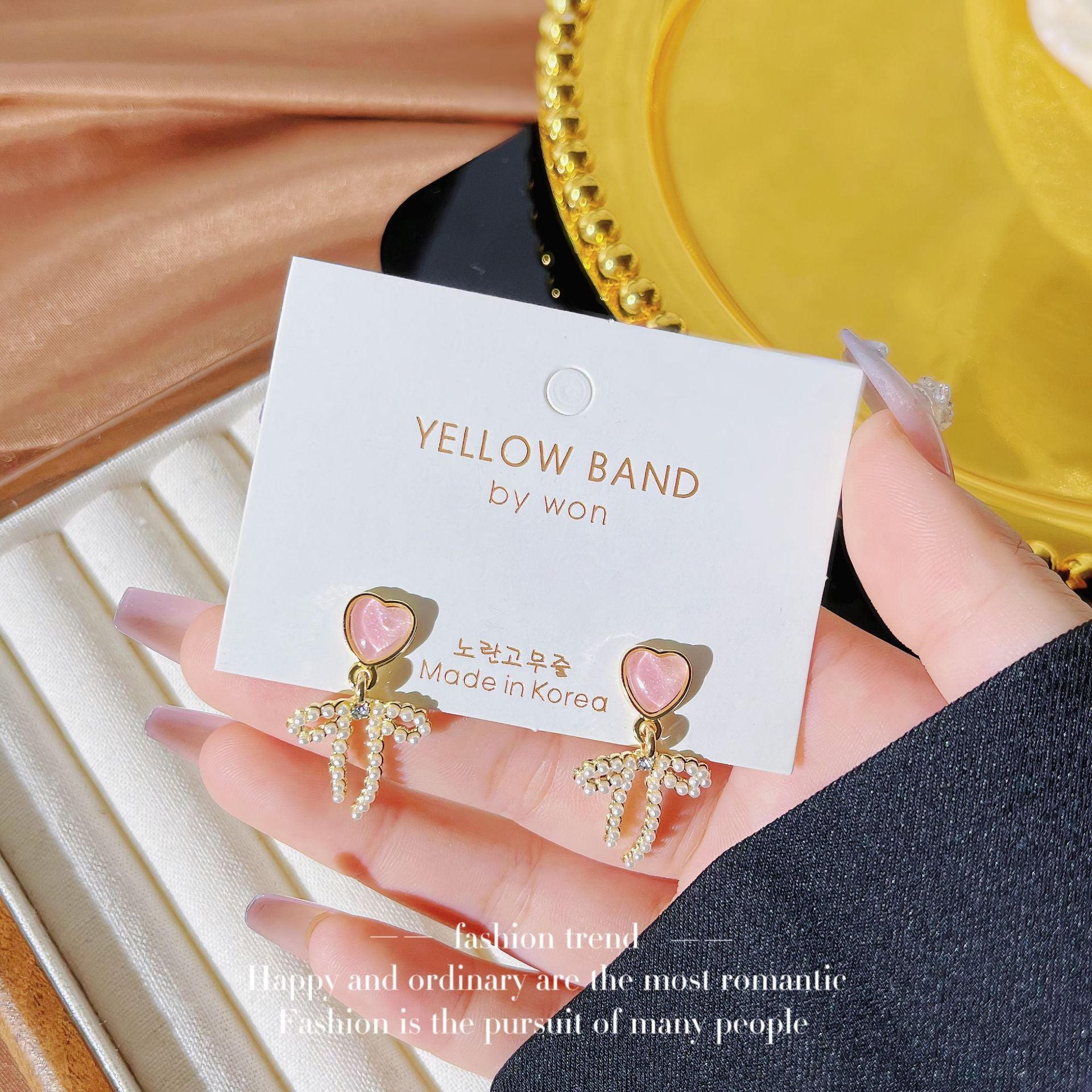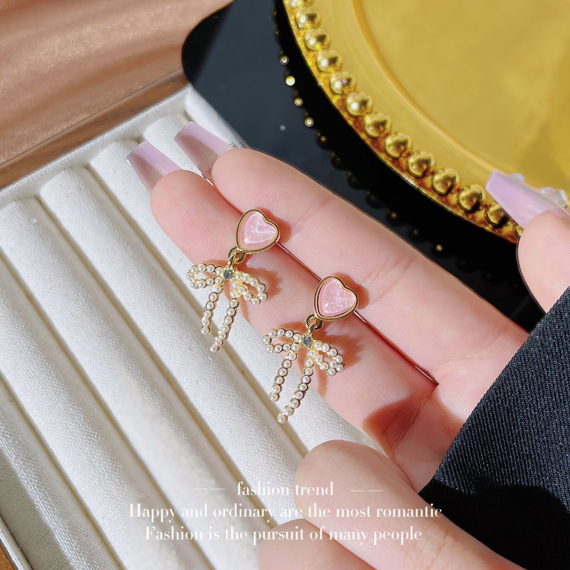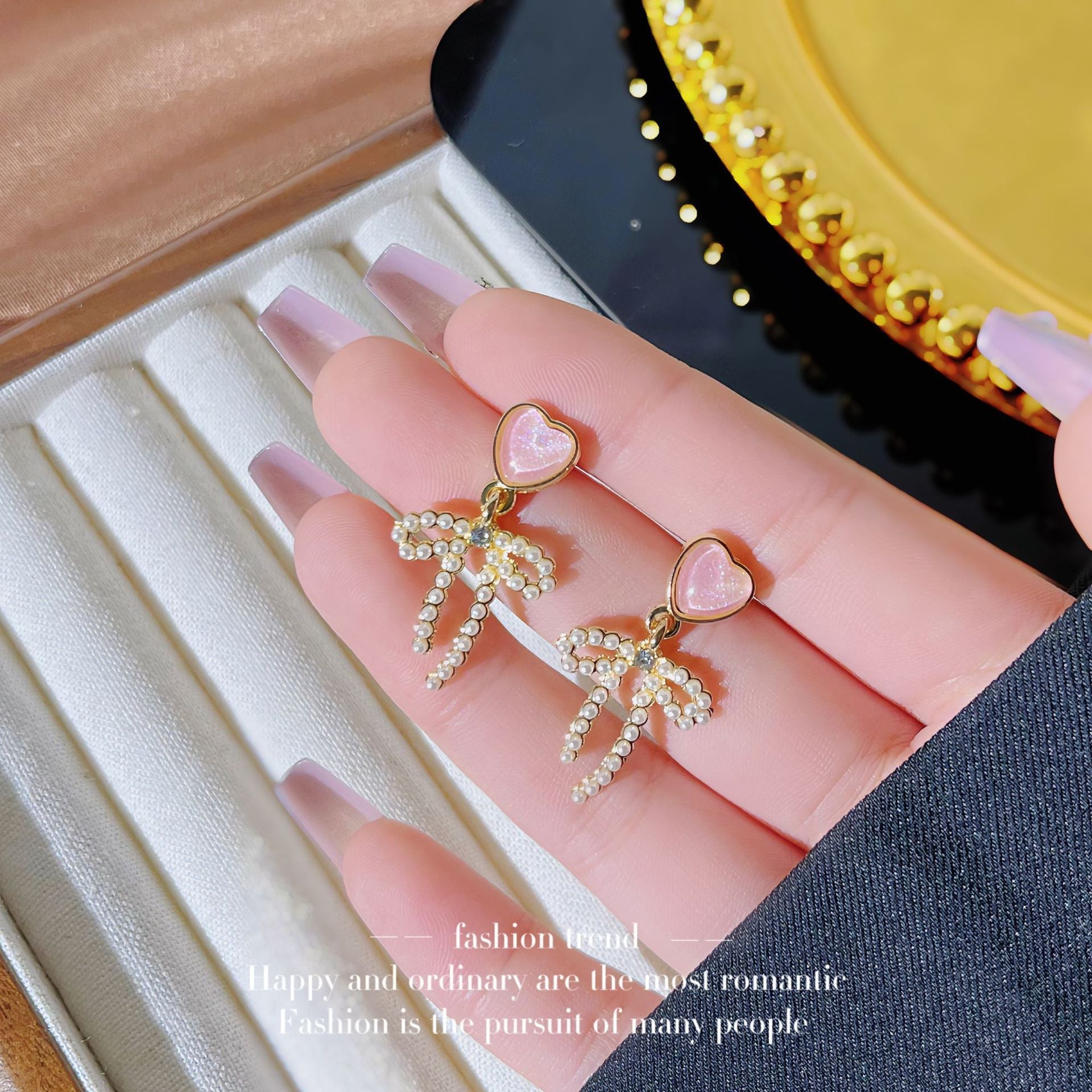 Sweet Pink Bow Love Heart Female Sier Needle Earrings